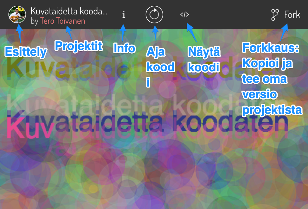 Lyhytlinkki tälle sivulle on https://bit.ly/kuvataidetta-koodaten (voit kirjoittaa selaimen osoiteriville pelkästään bit.ly/kuvataidetta-koodaten). Osoite pitkässä muodossaan on https://www.teromakotero.fi/kuvataidetta-koodaten/, Voit käyttää oheista sivua vapaasti opiskellaksesi tai opettaaksesi Processing-ohjelmointia ja kuvan tekemistä