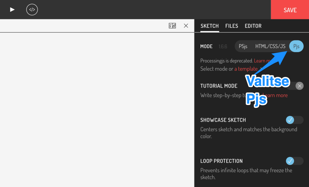 Tärkeä huomio: kun menet OpenProcessing ympäristöön ja lähdet tekemään omaa projektiasi oletusvalinta ohjelmointikieleksi on P5js. Se perustuu JavaScriptiin, jonka komennot ovat erilaisia kuin tässä kurssissa käytetyt Java-kieleen perustuvat komennot. Siksi valitse oikeasta reunasta kieleksi Pjs, niin voit ohjelmoida tämän kurssin ohjeiden mukaisesti. Koska web-selain toimii JavaScriptillä, kääntää editori myös Java-kielen JavaScriptiksi.